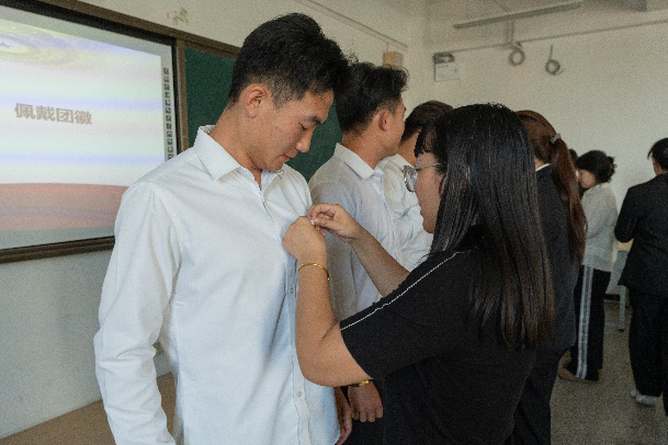 仪式在庄严的国歌声中拉开序幕。财贸系团委书记柴泳泳宣读新团员名单,并与老团员代表一起为新团员佩戴团徽,一枚枚团徽在胸前闪耀,象征着共青团精神的传承与接力。