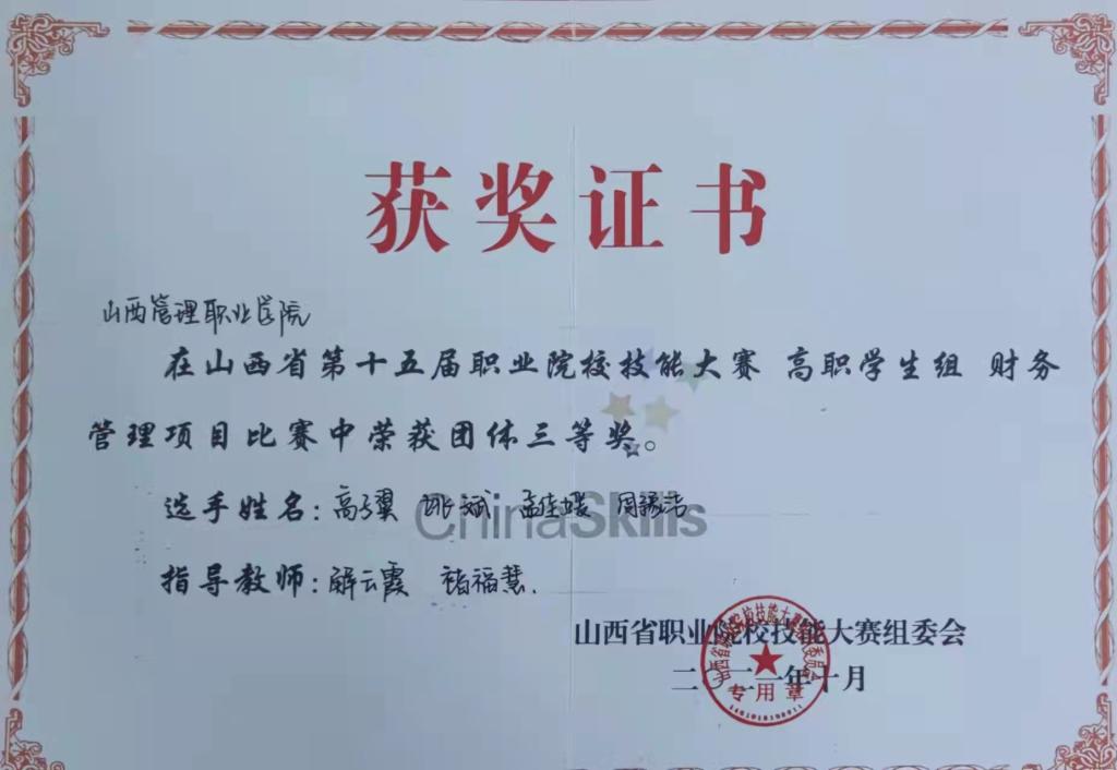 米乐在山西省第十五届职业院校财务管理技能大赛中获奖