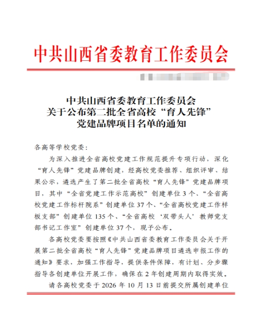 近日,中共山西省委教育工作委员会印发《关于公布第二批全省高校“育人先锋”党建品牌项目名单的通知》,管理与服务系党支部成功入选“全省高校党建工作样板支部”创建单位。