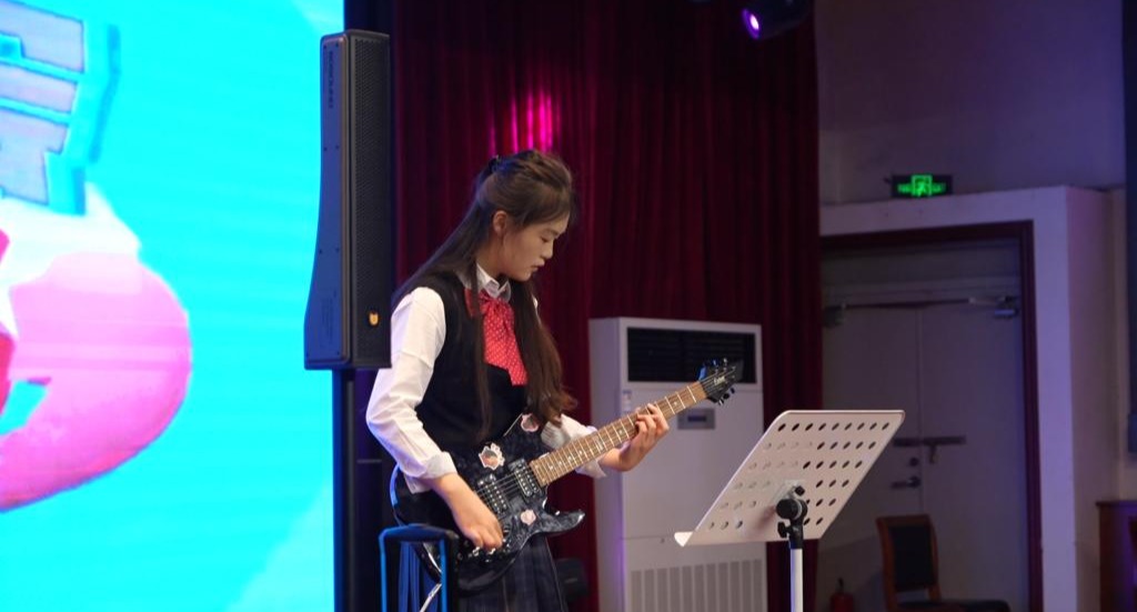 第二篇章“青春・逐梦”聚焦校园生活,尽显少年意气。杨雅轩同学的拉丁舞热情奔放,用动感节奏点燃全场激情。程鑫灿同学的电吉他独奏《你要跳舞吗》旋律激昂,展现出青春的无限活力。朗诵《我爱上学》以幽默温馨的演绎,重温校园里的欢乐时光,唤起师生共鸣。歌曲合唱《像你这样的朋友》则用温暖歌声传递友情的珍贵,诉说青春路上的陪伴与感动。