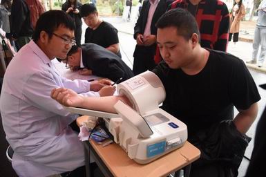 献血车上,悬挂着捐献青春热血 彩绘人生画卷的横幅。工作人员引导填表,细心询问身体情况,认真体检、验血、抽血,叮嘱献血后的注意事项,医务人员对同学们有关献血问题进行了一一进行了解答,解除了同学们心中的疑虑。各项工作有条不紊的进行着,周到细致的服务舒缓了献血者紧张的心情。共计216人成功献血,献血总量达70800毫升。