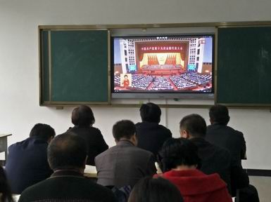 上午9点,院领导贾二元、岳澎、马联合、李强、郭敬仁、宋沧,和全院90多名党员,在综合楼403教室一同观看了十九大开幕式直播。大家怀着无比激动的心情,聚精会神,认真聆听,边收看边记录,不时为习近平总书记的报告所打动、所鼓舞,掌声阵阵。
