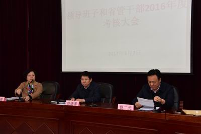 37上午,米乐2016年度领导班子和省管干部考核大会在实训楼四层报告厅召开。省人社厅考核组组长、副厅长贺德孝等一行6人出席会议。大会由院党委书记贾二元主持。