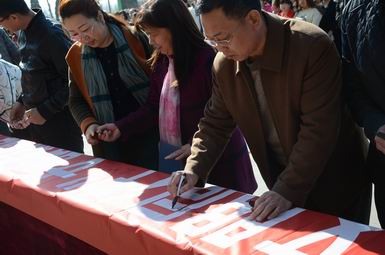 学生处副处长张文斌,在主持仪式中,对活动进行了详细安排。班主任老师和广大学生在横幅上郑重签上了自己的名字,表达了“与文明同行”的决心。