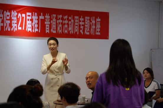 活动现场,王彤老师做了以《普通话语音与应用技巧》为主题的专题讲座,她从普通话语音、声音塑造、演讲与口才的实用方法和方言纠正练习四个方面浅入深出地为在场的老师和同学带来了一场生动的讲授。王彤老师的精彩讲授赢得了台下听众的一致好评,尤其是在讲座尾声她专门与师生进行了亲密互动。在场师生都认为老师的讲座内容与自身所需紧密相连,讲授方式生动形象,能产生很深的共鸣,有助于个人成长、受益良多。大家纷纷表示今后将大力推广普通话,更深入地阅读和理解中华优秀传统文化的经典著作,传承和弘扬其中的精髓,让古老的文化在新时代绽放更加绚烂的光彩。