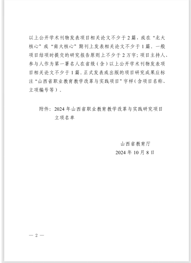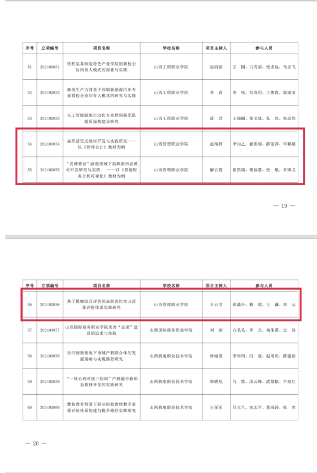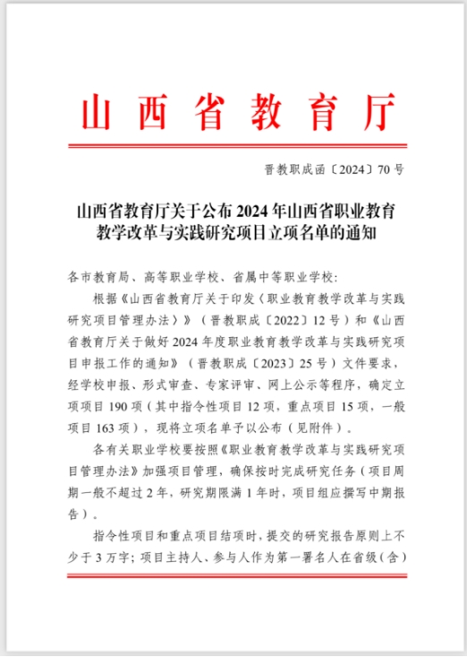 近日,山西省教育厅公布了 2024 年山西省职业教育教学改革与实践研究项目立项名单,米乐教师赵瑞婷《高职活页式教材开发与实践研究——以<管理会计>教材为例》、解云霞《“岗课赛证”融通视域下高职新形态教材开发研究与实践——以<智能财务分析可视化>教材为例》、卫云芳《基于模糊综合评价的高职岗位实习质量评价体系实践研究》成功入选。
