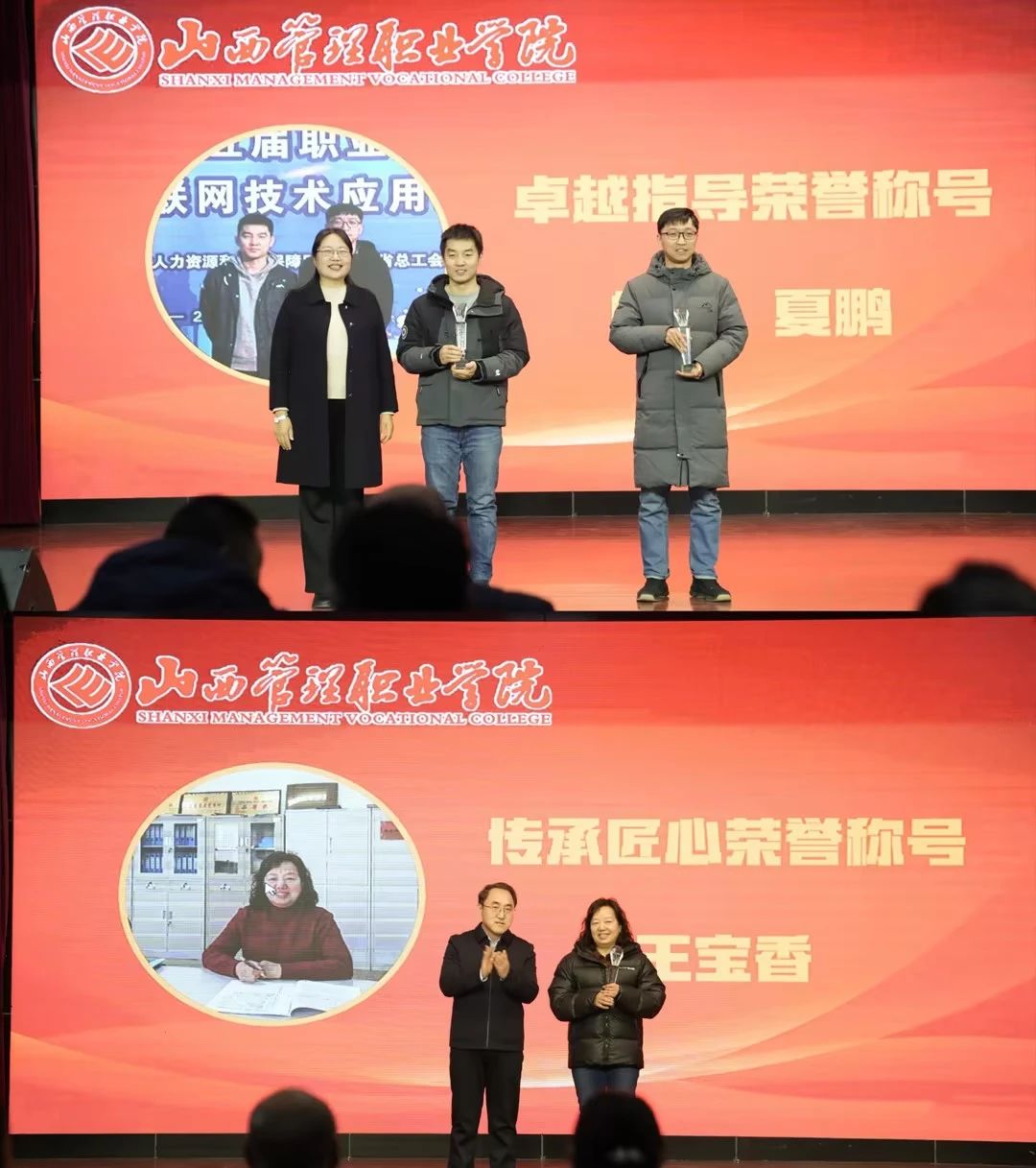 在激昂的颁奖音乐中,大会进入了激动人心的颁奖环节。院领导及各系部负责人为获得奖项的师生颁发奖金,为杨帆、夏鹏老师颁发“卓越指导”荣誉称号,为王宝香老师颁发“传承匠心”荣誉称号。