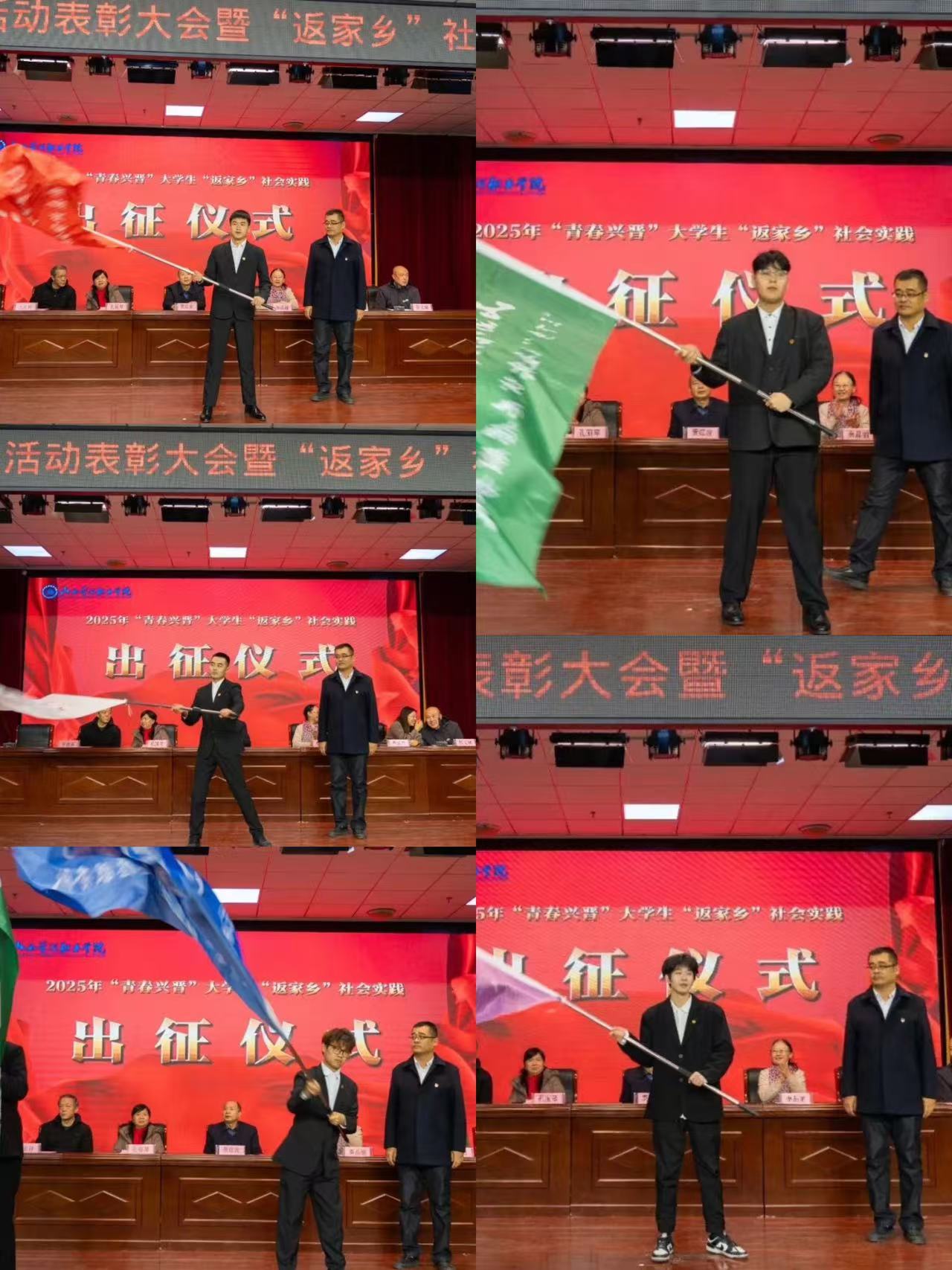 ▲院团委副书记李军峰为各系“返家乡”代表授旗