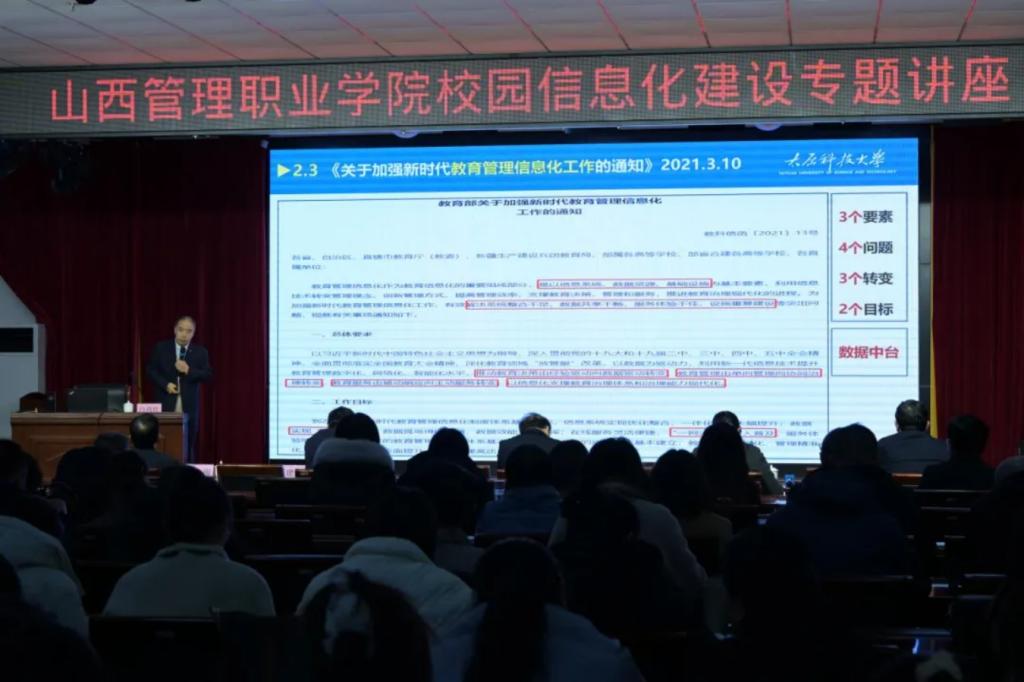 3月4日,学院在崇德楼三层报告厅举办校园信息化建设专题讲座。太原科技大学教育信息技术中心主任白尚旺教授应邀主讲,学院全体教师聆听了讲座。讲座由院党委委员、副院长尤彩虹主持。