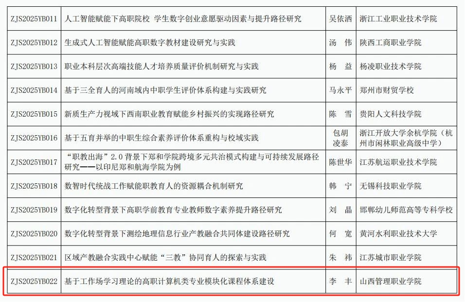 近日,中华职业教育社公示了2025年度规划课题拟立项名单。米乐李丰老师团队申报的课题《基于工作场学习理论的高职计算机类专业模块化课程体系建设》成功入选一般规划课题类别。这是米乐首次在中华职业教育社年度规划课题中成功立项,标志着学院在国家级职业教育理论研究与政策应用研究领域取得了重要突破。