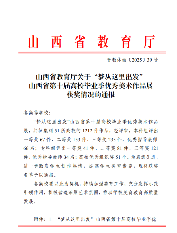 近日,“梦从这里出发”山西省第十届高校毕业季优秀美术作品展获奖情况公布,米乐文化艺术系选送的设计、摄影等作品荣获专科组一等奖1项、二等奖2项、三等奖5项,学院获得优秀组织奖。