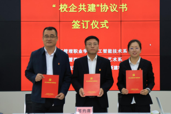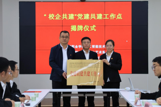 在全体参会人员见证下,三方代表共同签署《党建联建共建协议书》;随后,学院两系党支部书记联合“校企党建联建共建工作点”授牌,标志着双方党建合作落地