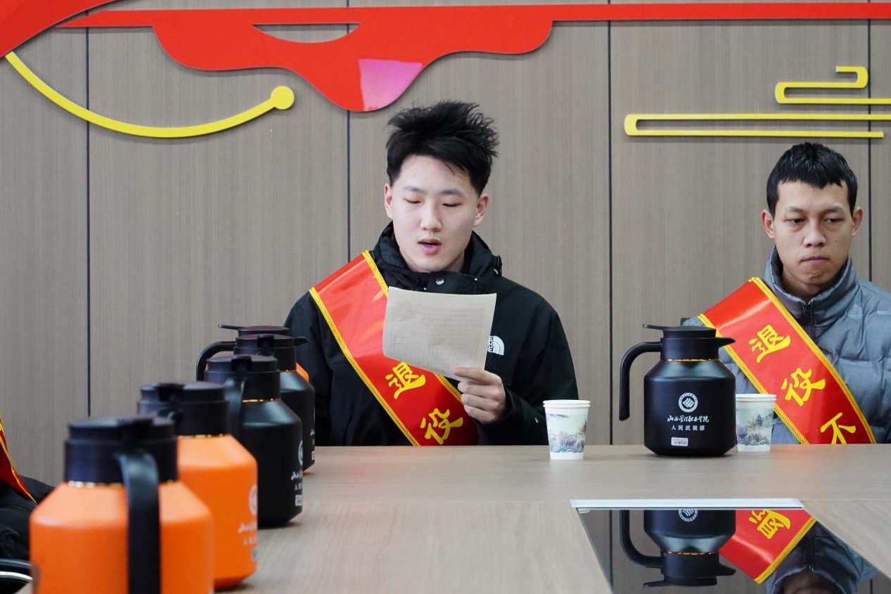 退役复学大学生代表李文池同学发言。他深情分享了自己的军营岁月与职教感悟,表达了对军营的眷恋和对校园的热爱。