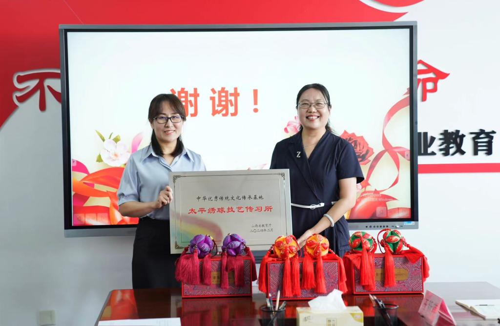 会上王爱国、尤彩虹授刘云芳、梁艳“太平绣球技艺工作坊”牌匾、“太平绣球技艺传习所”牌匾、“太平绣球技艺实践实训基地”牌匾。