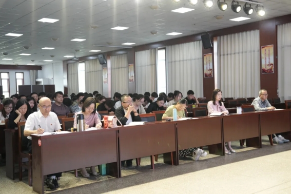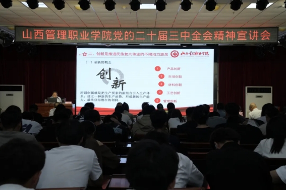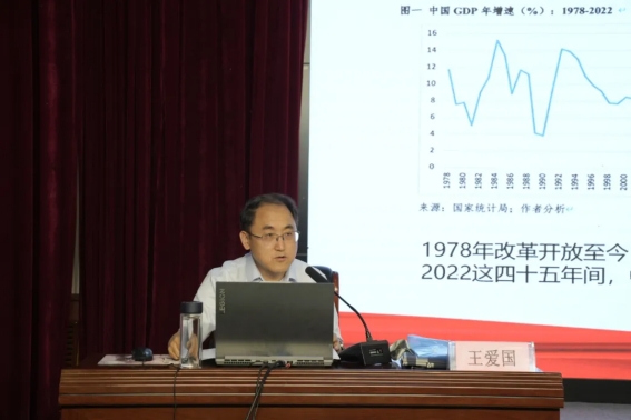 王爱国结合党的二十届三中全会精神学习体会,针对授课主题,从五个方面:一、回望过去,中国经济快速增长的奇迹背后的原因是什么?二、立足当下,全面创新体制机制背后的战略考量是什么?三、面向未来,关于教育、科技和人才的具体部署是什么?四、如何贯彻落实关于教育、科技和人才的具体部署;五、结合当前学院发展如何争做改革创新生力军,与在座师生进行深入交流。