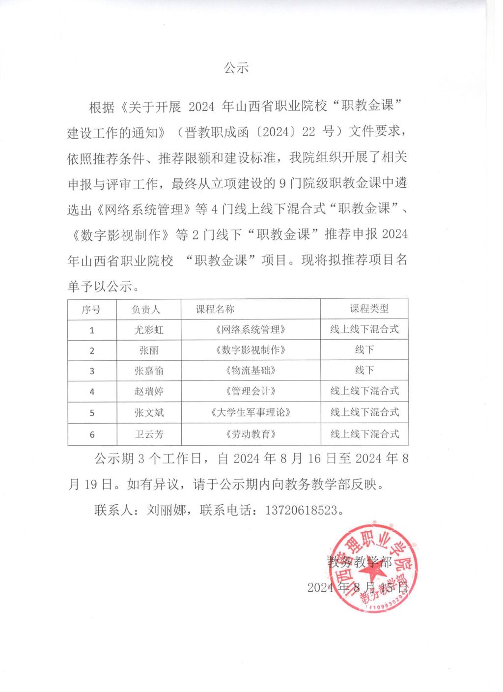 关于2024年山西省职业院校“职教金课”推荐申报课程名单的公示