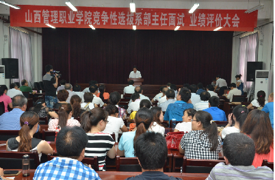由院党委书记刘锐,院长杨勇翔,山西师大传媒学院院长、硕士生导师王云教授,山西师大外国语学院院长硕士生导师田金平教授,山西师大原文学院院长、教务处处长、博士生导师亢西民教授,省人社厅人事处正处级调研员孙四军同志,省人社厅监察室副主任田建光组成评审专家组,进行现场面试评审。经资格审查,共有9人分别竞聘公共管理系、商贸系、信息管理系和基础教学部主任岗位。在竞聘人员竞聘演讲的基础上,评审专家组进行面试评分,全体教职员工进行业绩评价。