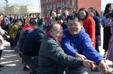“加油!加油!……”,一浪一浪的加油声响彻在校园上空。37日下午,米乐庆祝“三八”妇女节教工拔河比赛正在激烈进行。