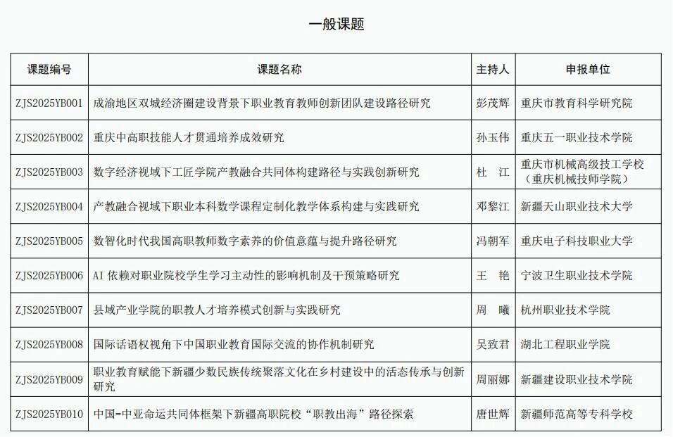 中华职业教育社年度规划课题旨在深入贯彻落实国家关于职业教育的重大决策部署和《教育强国建设规划纲要(2024—2035年)》,推动职业教育理论、政策和应用研究创新。本年度申报竞争异常激烈,全国共申报课题3065项,经省级社资格审查、推荐及总社专家严格评审,最终拟立项课题仅226项(含重大6项、重点86项、一般134项),立项率约7.4%。