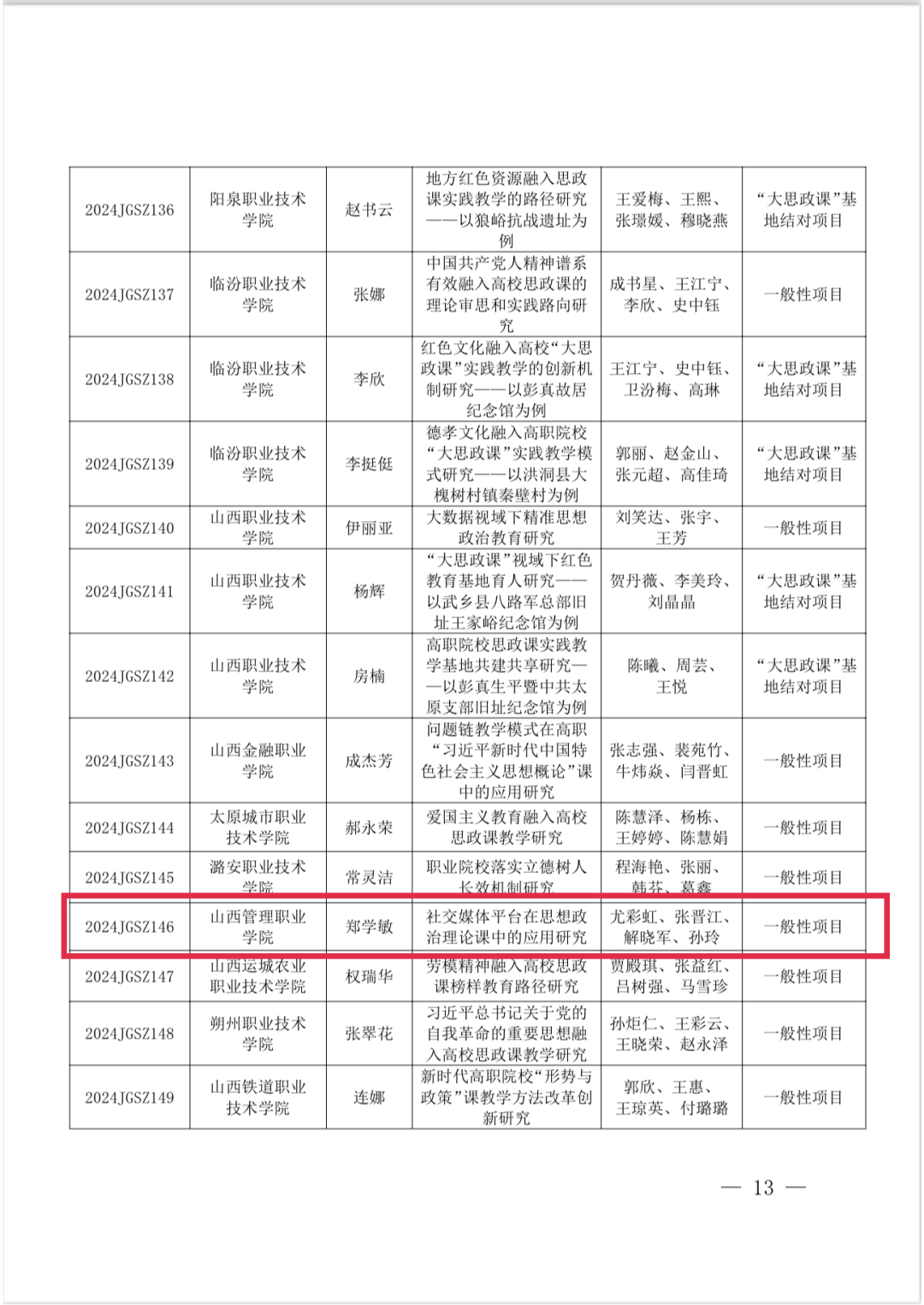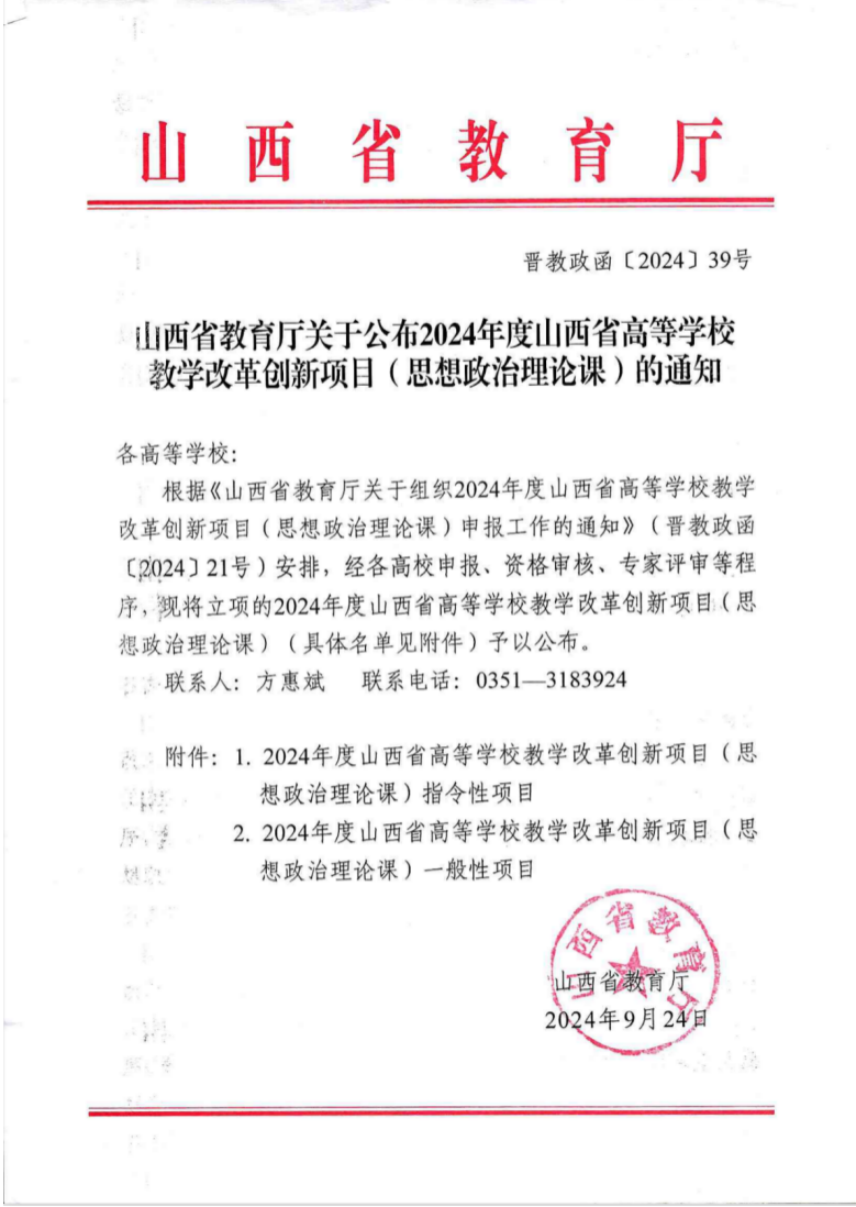 近日,山西省教育厅公布了2024年度山西省高等学校教学改革创新项目(思想政治理论课)的立项名单。米乐教师郑学敏《社交媒体平台在思想政治理论课中的应用研究》成功入选。