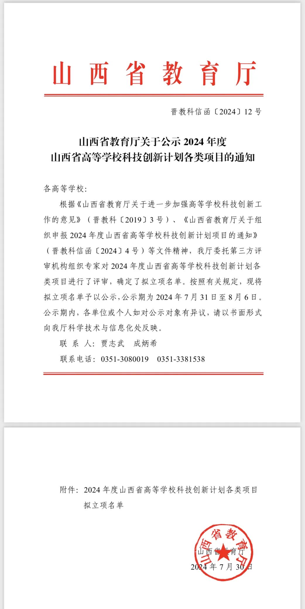 近日,山西省教育厅下发了《关于公示 2024 年度山西省高等学校科技创新计划各类项目的通知》(晋教科信函〔2024〕 12号),米乐组织申报的10个项目全部获批立项。
