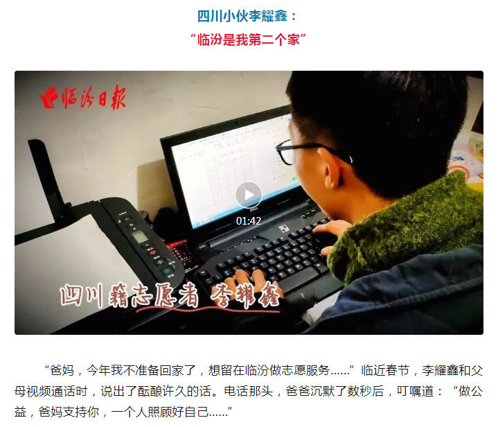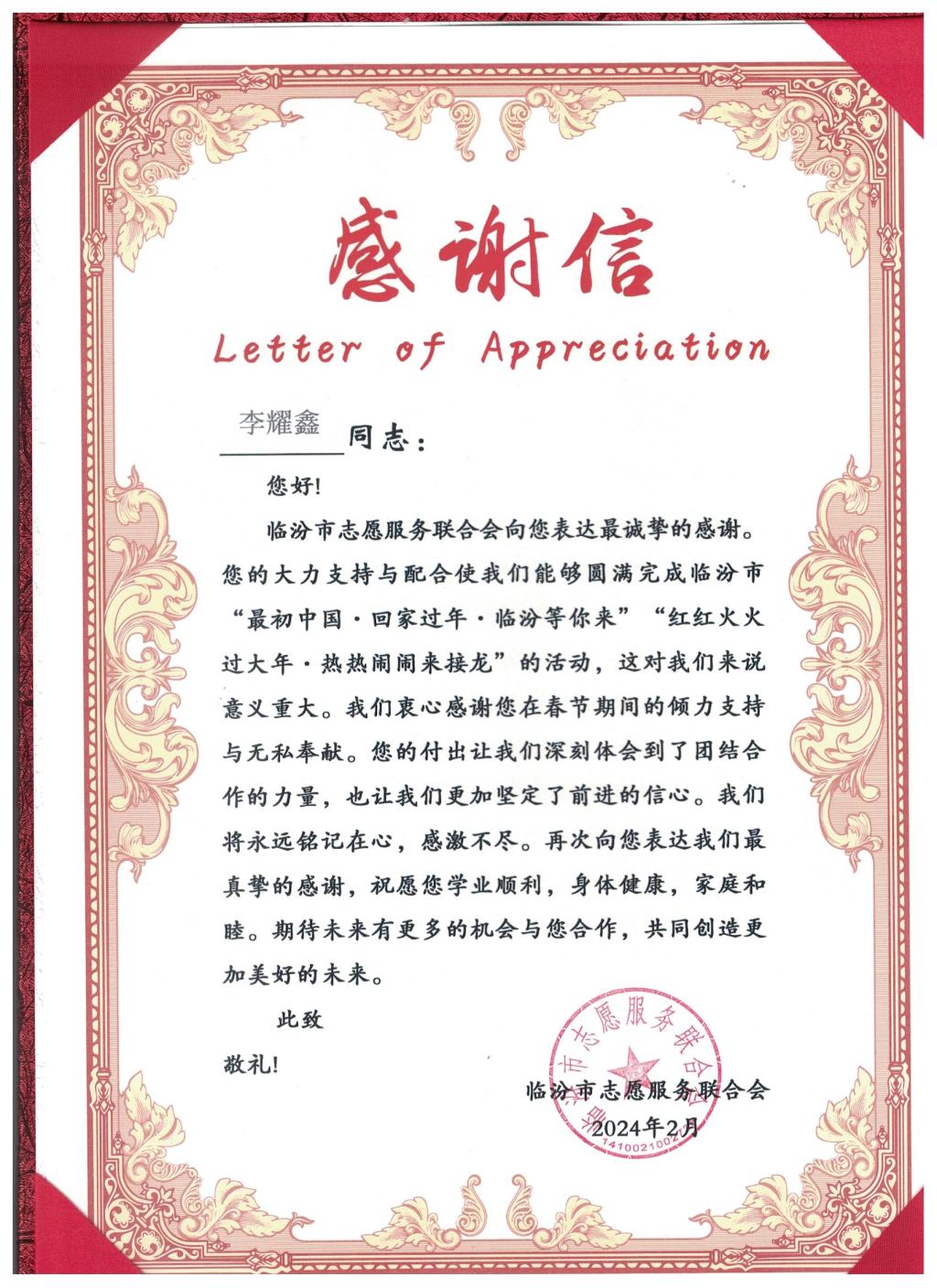 四川籍学生李耀鑫2024全年积极参与共青团市委、临汾市文明办、文化旅游局、志愿服务联合会、学院举办的各项活动和志愿活动,其事迹被临汾日报进行了报道,并收到临汾市志愿服务联合会的感谢信。