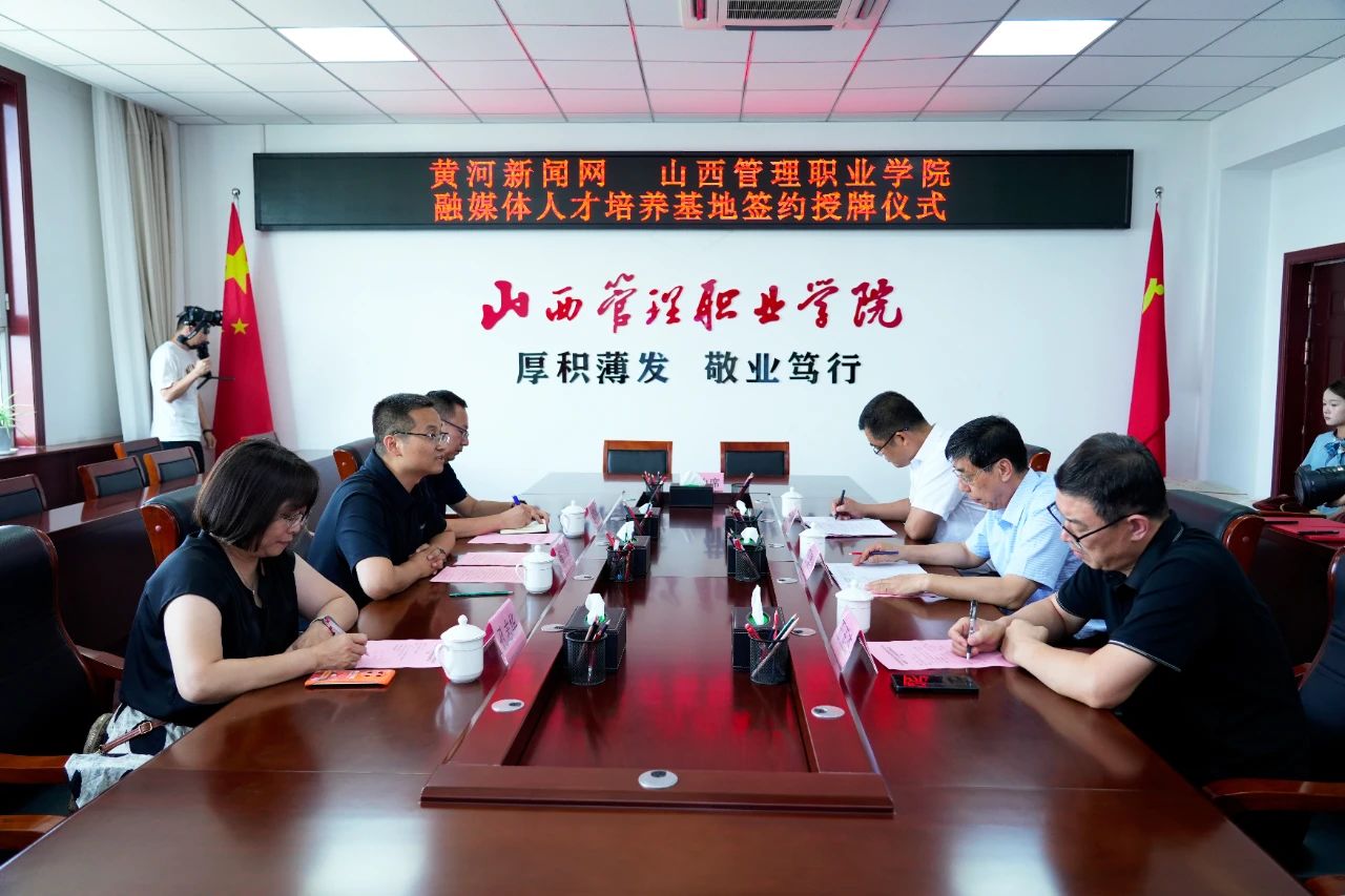 6月10日,为深化产教融合,创新人才培养模式,学院与黄河新闻网在崇德楼1210会议室隆重举行"融媒体人才培养基地"签约授牌仪式。黄河新闻网相关负责人,学院党委副书记丁建业出席仪式并代表双方签署合作协议。
