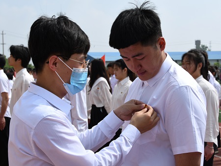 会上,张文斌宣读了2022年新发展团员名单和2022年“5·25”大学生心理健康教育月活动实施方案。各系团委书记、三支队伍教师和团干部代表为新团员佩戴了团徽。优秀青年教师代表刘昕昕带领全体新团员在团旗下庄严宣誓。优秀团员陈芳芳作为入团介绍人代表宣读了《团章》中有关团员义务和权利的条款。老团员代表窦星宇和新团员代表李泽华先后在仪式上发言。