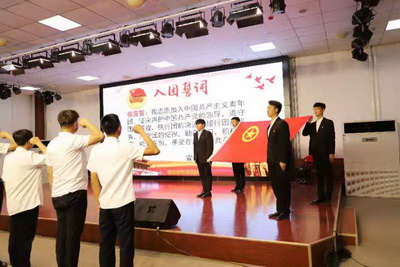 伴随着庄重、铿将有力的国歌,入团宣誓仪式拉开帷幕。全体团员在鲜艳的团旗下,紧握右拳,重温入团誓词。青春誓言,高昂雄浑,表达了对共青团的无限向往和豪迈激情。