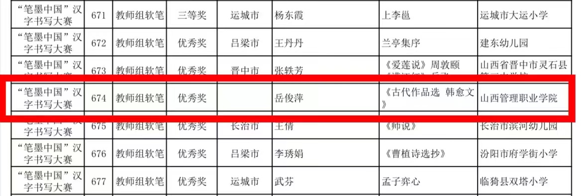 10月12日,第五届中华经典诵写讲大赛“诵读中国”经典诵读大赛、“印记中国”师生篆刻大赛和“笔墨中国”书写大赛山西赛区评选结果揭晓。米乐荣获第五届中华经典诵写讲大赛山西赛区优秀组织奖(集体)1项;“诵读中国”经典诵读大赛优秀组织奖(个人)1项、学生诵读作品二等奖1项、优秀奖1项;“印记中国”师生篆刻大赛优秀组织奖(集体)1项、二等奖1项、优秀奖1项;“笔墨中国”汉字书写大赛教师组硬笔一等奖1项、教师组软笔优秀奖1项。诵读作品二等奖和书写作品一等奖已经提交参加国赛,篆刻比赛首次参赛。