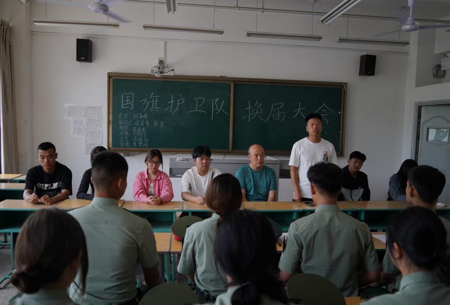 2024年5月30日12点20分 ,国旗护卫队在综合楼201教室隆重举行了换届大会,这标志着国护即将迈入新的发展阶段,也是每一位社团成员对未来满怀期待的见证!本次大会由国旗护卫队队长刘豪杰主持,社团指导老师张文斌和院团委指导老师董群发到达现场,共同见证这一重要时刻。