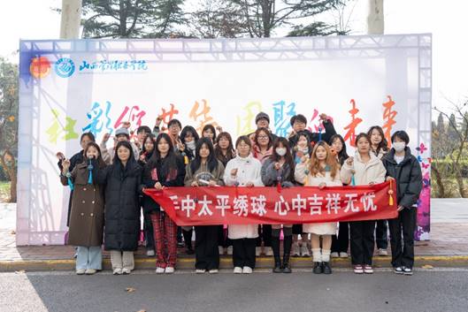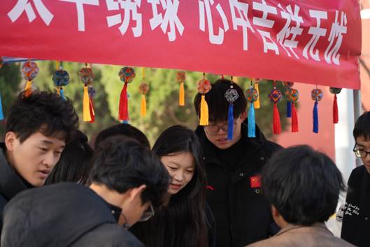 活动现场高挂的绣球都由太平绣球社团成员亲手制作,蕴含着同学们的用心和巧思,它们不仅装饰了场地,更营造出了一种温馨和谐的氛围。太平绣球由12个花瓣拼接缝合而成,每个花瓣都蕴含着对一年12个月份的美好寓意,象征着团团圆圆和和睦睦。
