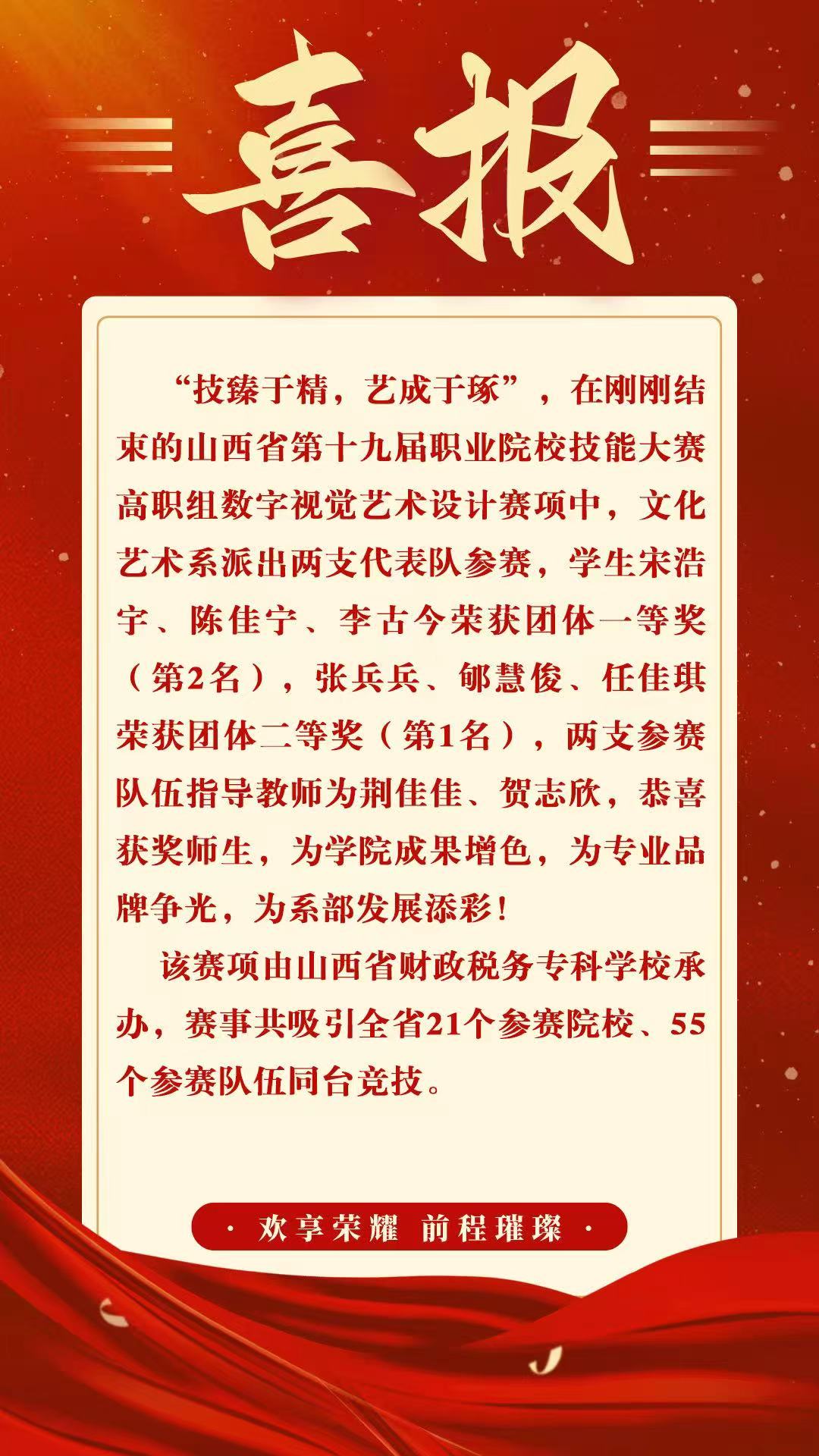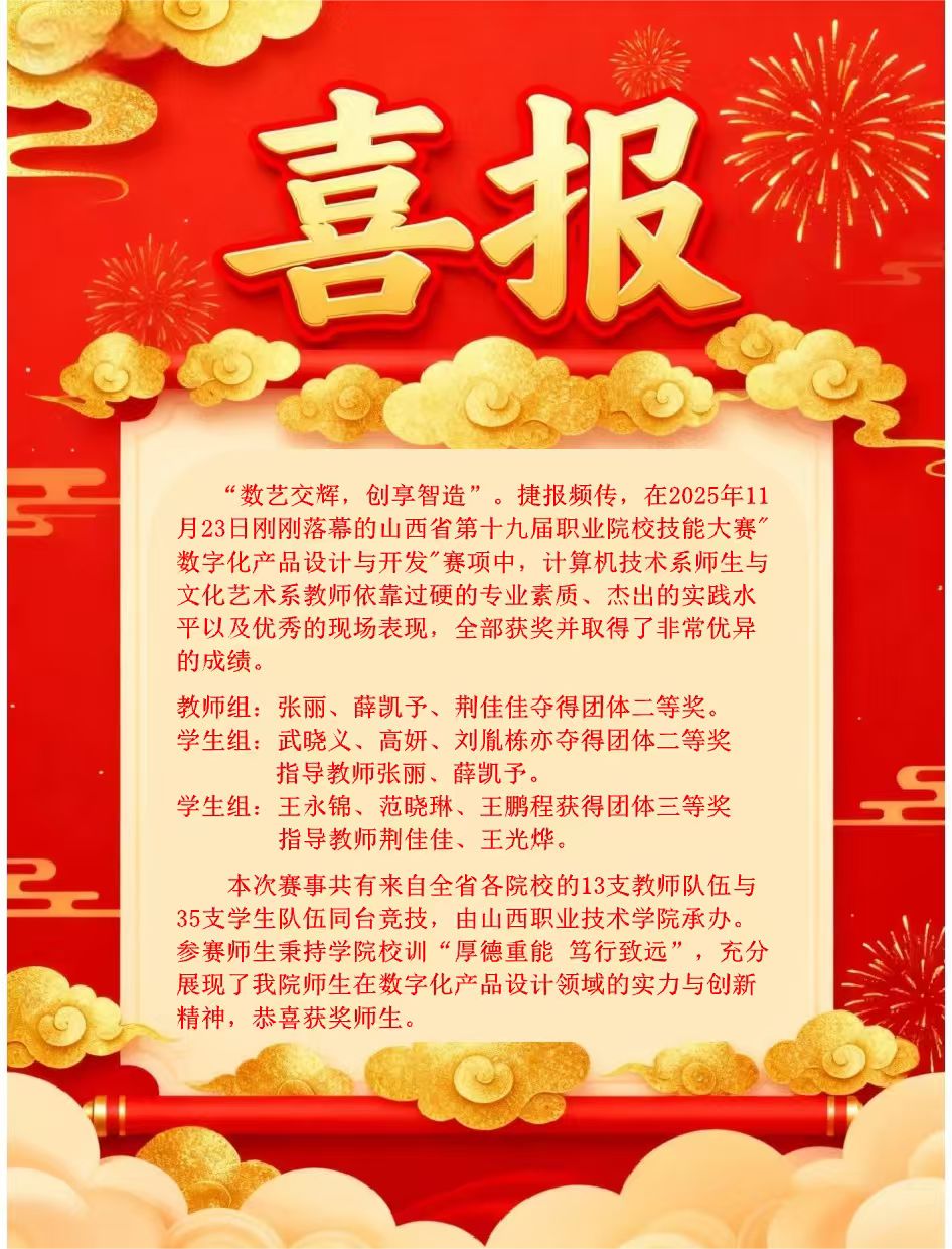 近日,文化艺术系师生参加的山西省第十九届职业院校技能大赛各赛项圆满落幕。师生凭借扎实的专业功底、创新的设计理念与出色的实践能力,在数字视觉艺术设计、短视频创作与运营、舞台布景等多个赛项中奋勇争先,最终斩获19项大奖,其中一等奖1项、二等奖8项、三等奖10项,充分展现了我系人才培养的丰硕成果与师生的昂扬风采。