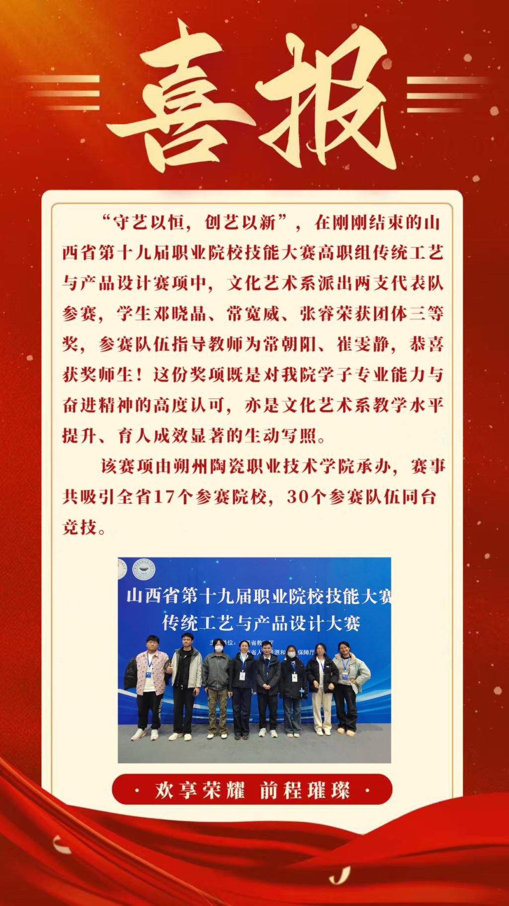 赛前,师生认真研读比赛章程,遇到难题协同攻坚、反复打磨;赛中,沉着应战、默契配合,充分展现了我系师生过硬的职业素养与团队协作精神。这些奖项是我系深化“以赛促教、以赛促学、以赛促进”的生动实践。未来,文化艺术系将持续聚焦高技能人才培养,深化产教融合,助力中华优秀传统文化传承与创新,为区域文化产业发展注入更多青春力量。