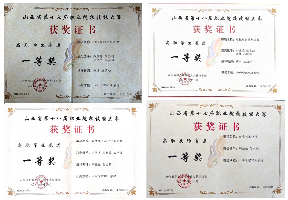 近年来,教学团队成员指导的学生作品,在山西省毕业季美术作品展、全国大学生艺术展演活动中多次获得一二三等奖。专业教师多次在山西省毕业季优秀美术作品展中获得“优秀指导老师奖”,教师团队在山西省教学能力大赛中获得团队二等奖,自文化艺术系成立以来,捷报频传。获得山西省职业院校技能大赛一等奖9项,二等奖4项,三等奖9项。在全国大学生广告艺术大赛中获二等奖1项,三等2项。