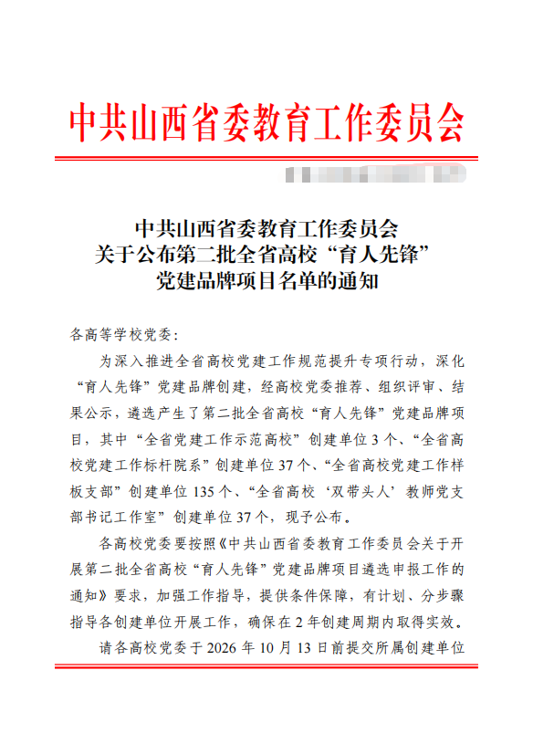 近日,中共山西省委教育工作委员会印发《关于公布第二批全省高校“育人先锋”党建品牌项目名单的通知》,米乐管理与服务系党支部和人工智能技术系党支部成功入选“全省高校党建工作样板支部”创建单位。