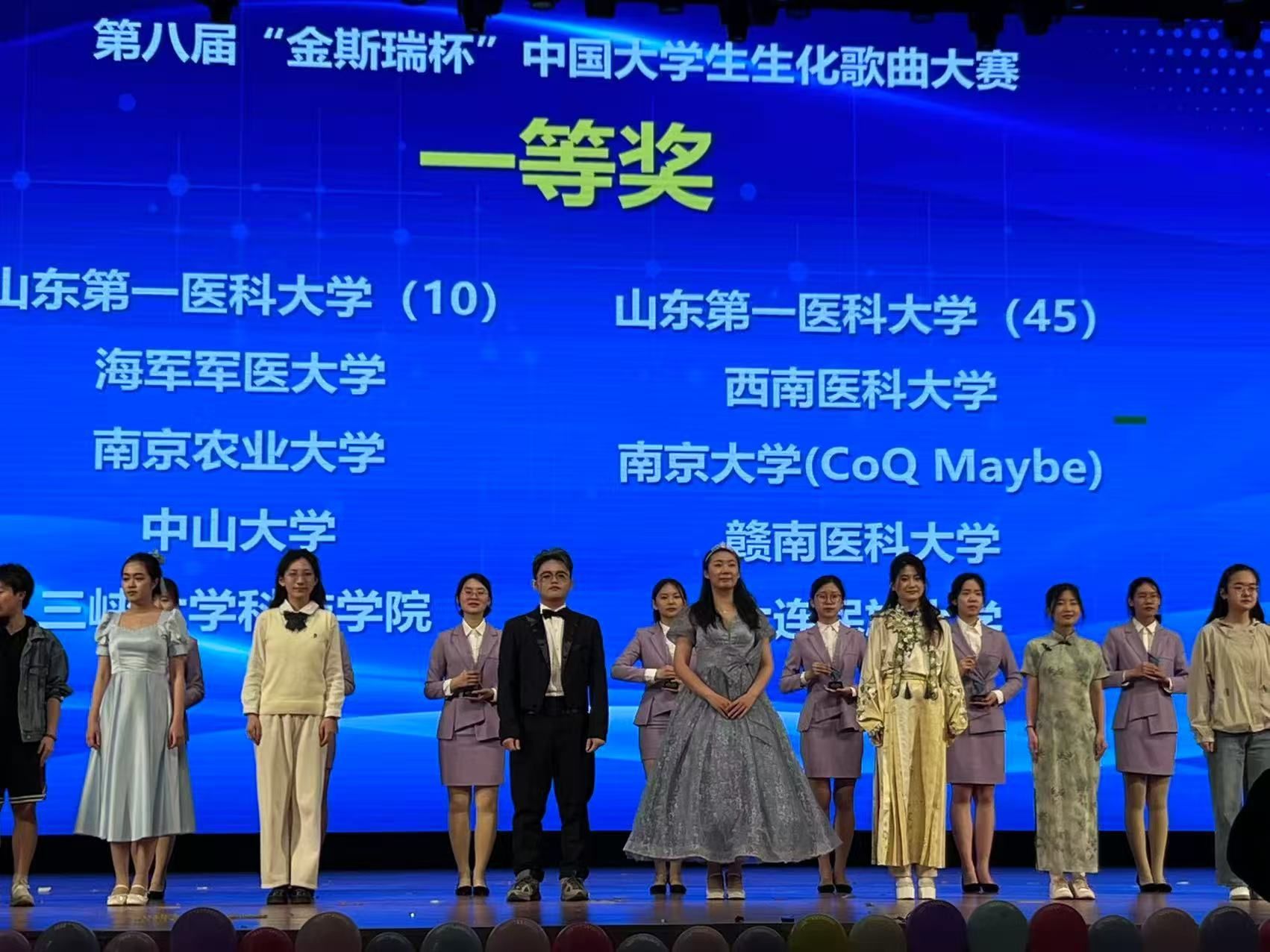 322-23日,由中国生物化学与分子生物学会教育专业分会主办的第八届金斯瑞杯中国大学生生化歌曲大赛在山东第一医科大学举行,来自北京协和医学院,南京大学,中山大学等全国68所高校师生参加了此次比赛。全讯基础医学院2023级临床医学专业学生张爱琳、杜秋慧、周霖、何炳贤,药学专业学生郑柳怡,在基础医学院生化教研室老师的带领下代表学校参加了比赛,并在70支高校代表队伍中脱颖而出,获得全国一等奖的优异成绩。