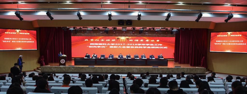 12月6日晚,以“共育社会栋梁,同谱青春乐章”为主题的全讯新2网官网2017-2018学年学生工作“创先争优”表彰大会暨各类奖学金颁奖仪式在城北校区德诚楼学术报告厅举行。在家党政领导廖斌、李尚志、刘毅、刘广益、彭钢、聂敏海出席会议;爱心企业泸州老窖股份有限公司副总经理、首席质量官何诚,泸州农村商业银行有限公司行长杨松,四川科瑞德制药有限公司人事行政总监刘志鸿,金伯利钻石销售公司川南大区销售总监杜山江应邀出席会议;学校各职能部门负责人,各二级院系领导,全体学生政工干部,获奖代表以及学生代表800余人参加会议。会议由学校党委副书记刘毅主持。