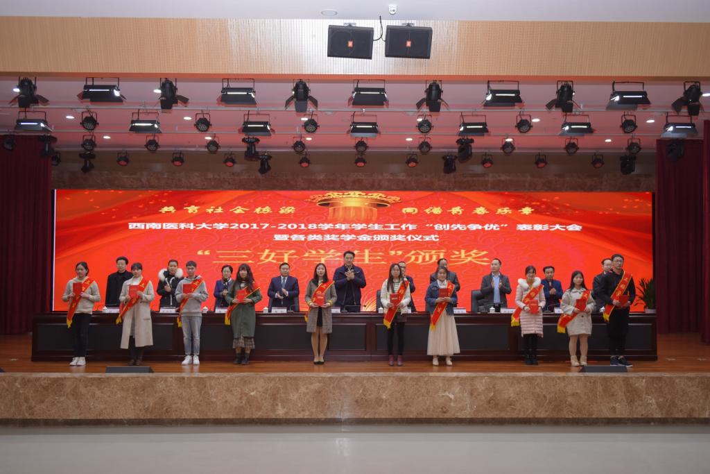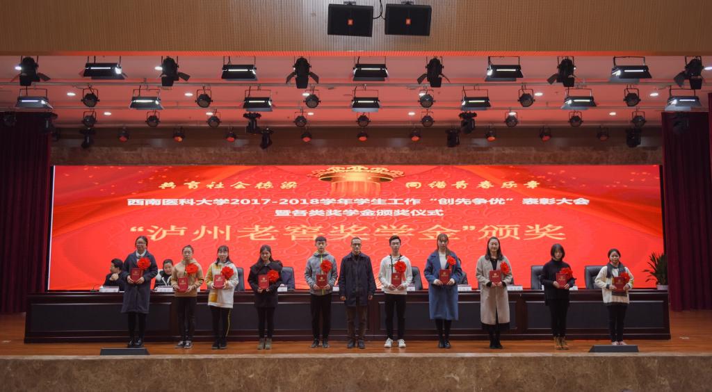 会上,学校党委常委、副校长刘广益代表学校致辞,强调学校召开本次表彰大会,旨在全面贯彻党的教育方针,坚持立德树人根本任务,着力构建全员育人、全过程育人、全方位育人的工作格局,形成有效激励机制,发挥示范引领作用,推进学生工作向更高质量更高水平发展。会议表彰了2017-2018学年度“先进班集体”“三好学生”“优秀学生干部”“三好学生标兵”,表彰了2017-2018学年度“十佳辅导员”“学生工作先进集体和个人”“学风建设活动品牌”。同时举行了2017-2018学年“国家奖学金”“国家励志奖学金”颁奖仪式,举行了泸州老窖奖学金、江之阳优秀学生奖学金、科瑞德奖学金、金伯利“十大学习之星”等社会类奖学金颁奖仪式。会上,先进个人学生代表麻醉系2015级1班学生廖宏森、先进个人教师代表临床医学院2015级二办辅导员曹姣、先进集体代表2017级中西医临床医学6班学生汪茂雯分别发言。