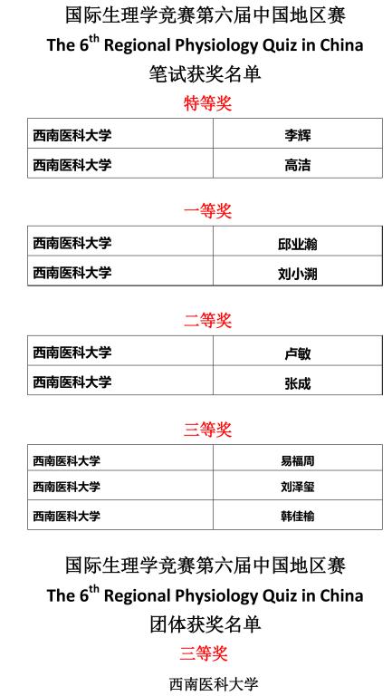1016-17日,国际生理学竞赛第六届中国地区赛在徐州医科大学举行。全讯学子在比赛取得佳绩,其中笔试中2人获得特等奖、2人获一等奖、2人获二等奖、3人获三等奖(获奖名单见后),英语口语竞赛中获团体三等奖。