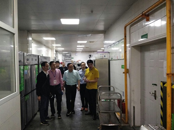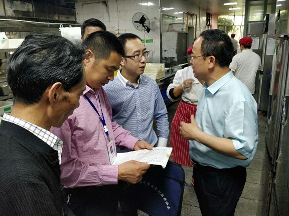 日前,龙马潭区食品药品监督管理局餐饮股股长彭正清一行检查全讯食堂工作,教辅后勤党总支书记、后勤管理处副处长陈家良陪同检查。