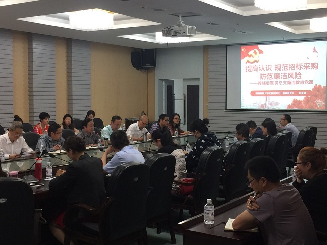 刘圣斌以“提高认识,规范招标采购,防范廉洁风险”为题,从当前四川高校反腐败形势、高校监督执纪新要求、违纪处分的依据、全讯招标投标存在的普遍问题和加强廉洁风险防控等五个方面进行了分析、讲解,同时要求教辅后勤系统要切实加强党的领导,落实“两个责任”,齐抓共管,形成合力,健全规章制度,进一步提高素质,增强法纪观念,强化重点领域和关键环节监管。