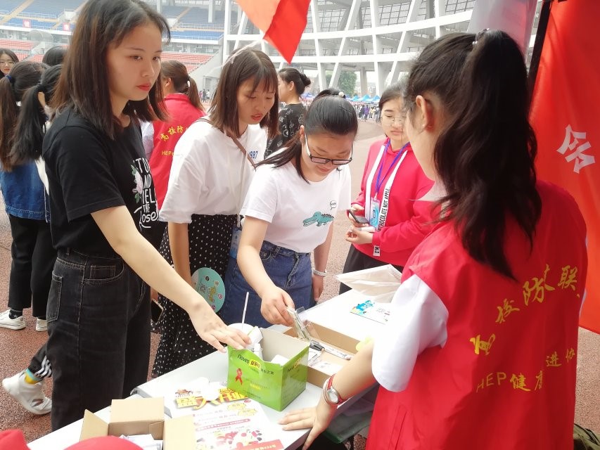 在校园越野跑阶段,参赛人员胸前佩戴红丝带,助力艾滋病健康教育宣传。越野跑后,进行了为期两天半的摆点活动。活动现场,志愿者们通过发放结核病和艾滋病宣传资料、有奖竞答、你比划我来猜等生动活泼的形式为过往师生宣传结核病和艾滋病的相关知识。