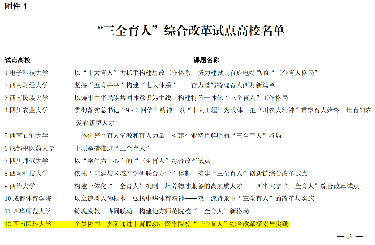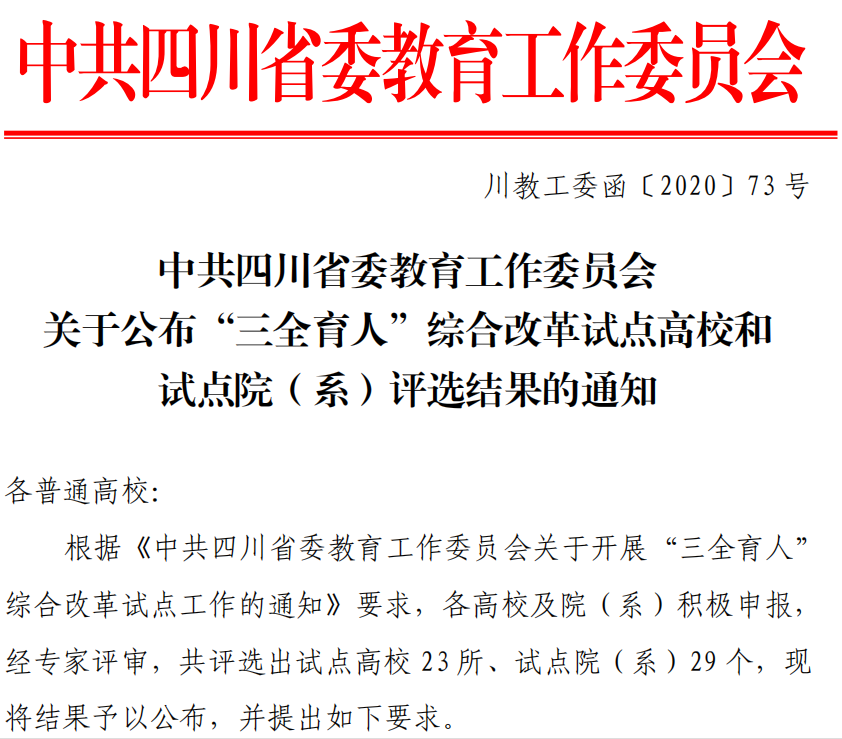 日前,省委教育工委发布《中共四川省委教育工作委员会关于公布“三全育人”综合改革试点高校和试点院(系)评选结果的通知》,全讯成功入选四川省“三全育人”综合改革试点高校。