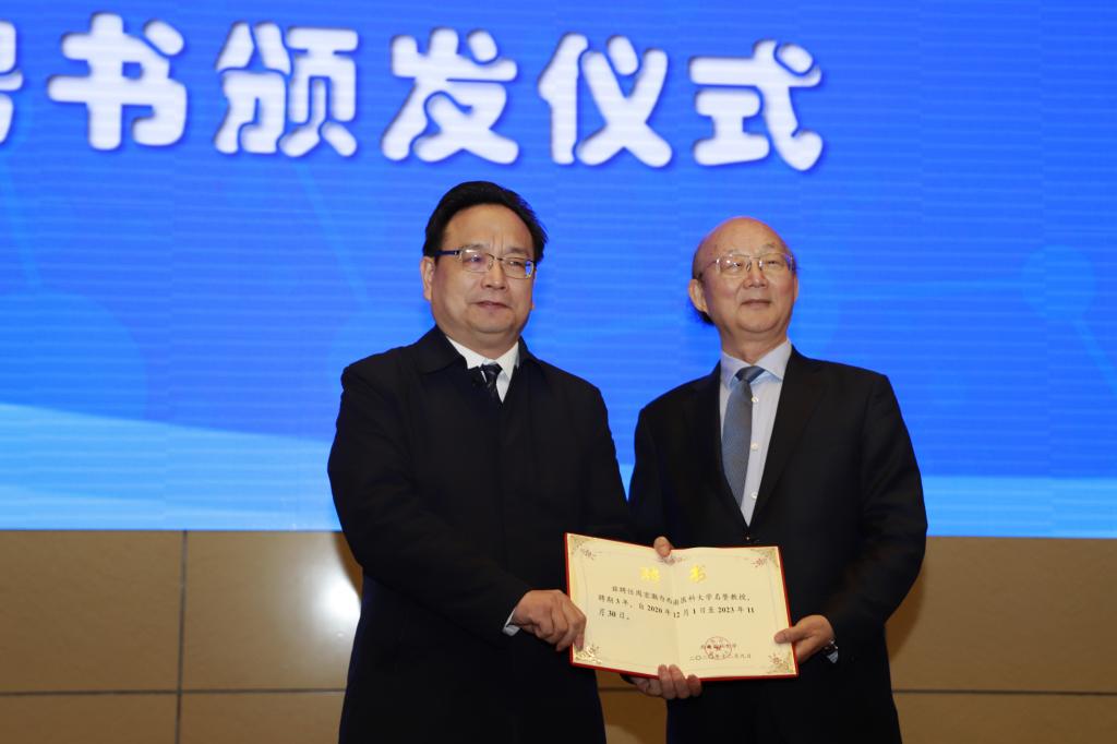 张春祥为周宏灏院士颁发了全讯新2网官网荣誉教授证书。李志为周宏灏、颜光美、杜冠华、余细勇、王忠、吕海涛、李素云、乌兰、苏秀兰、白长喜颁发了客座教授证书。