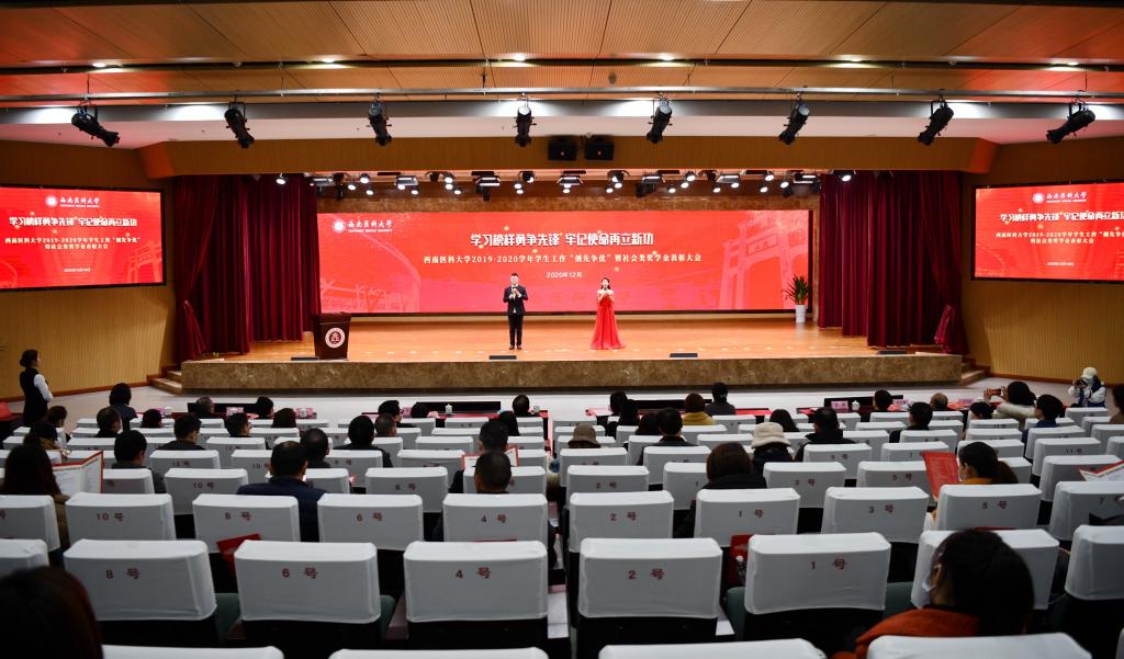 12月19日晚,以“学习榜样勇争先锋 牢记使命再立新功”为主题的学校2019—2020学年学生工作“创先争优”暨社会类奖学金表彰大会在城北校区第一学术报告厅举行。学校主持行政全面工作副校长张春祥,党委副书记、纪委书记李尚志,党委副书记刘毅,副校长刘广益、彭钢、聂敏海,学校各相关职能负责人、院系党政负责人、全体学生政工干部,泸州老窖股份有限公司任中榕等,泸州农商银行股份有限公司袁敏等,金伯利钻石公司余斌等,以及受表彰的先进集体和个人代表、学生代表共计400余人参加了大会。