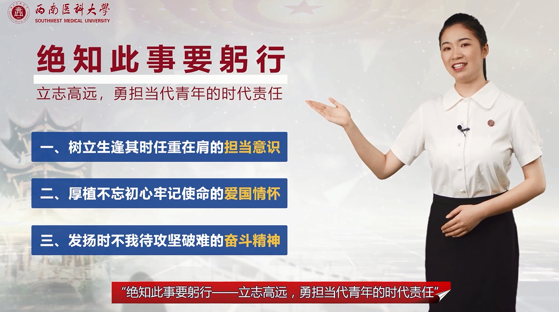 作品立足于当代青年大学生的理想信念问题,结合《思想道德修养与法律基础》课程要求、时代背景、“疫情”形势,引用全讯青年医生援鄂抗疫鲜活事例,从“树立担当意识”“厚植爱国情怀”“发扬奋斗精神”三方面分析当代青年大学生应如何担当时代责任,以青春之我创造青春之中国,为中华民族伟大复兴助力。