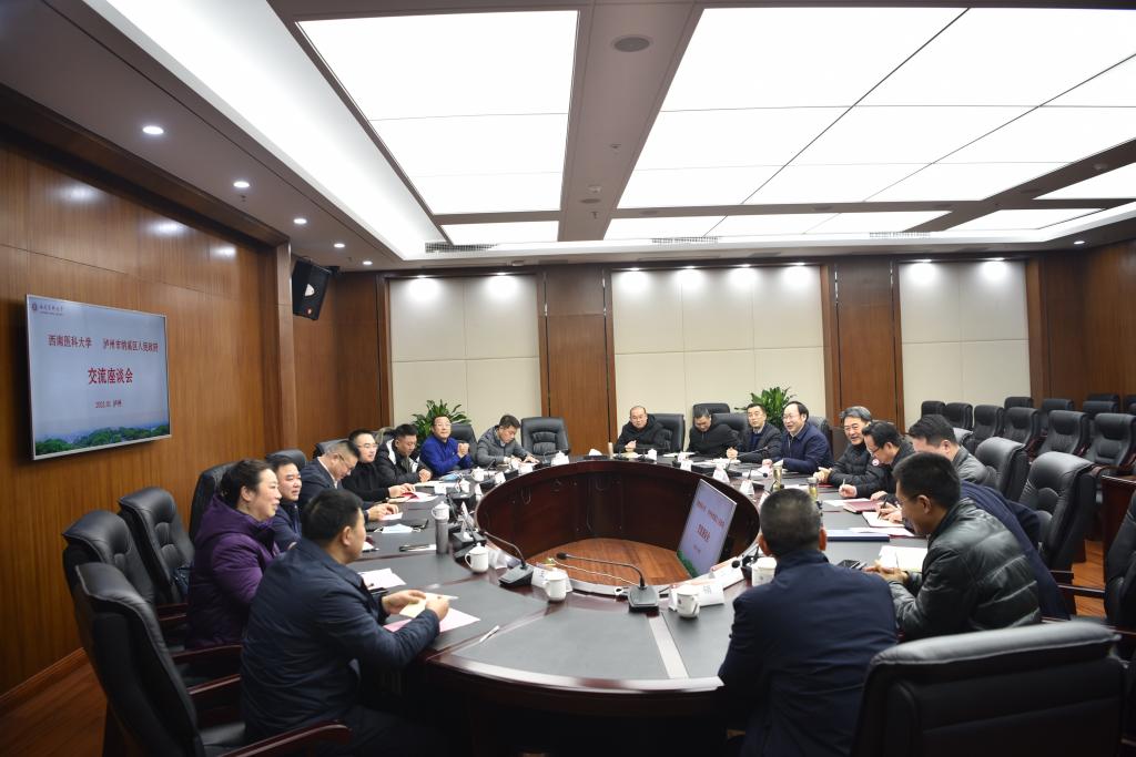 为进一步加强区校合作,助力地方经济社会发展,1月4日,纳溪区区委书记谭荣兵,区委副书记、代区长袁维荣率队来校交流座谈。学校党委书记廖斌,主持行政工作副校长张春祥,党委常委、副校长聂敏海,党政办公室、发展规划处、对外联络处、附属医院等相关部门负责人出席座谈会。会议由聂敏海主持。