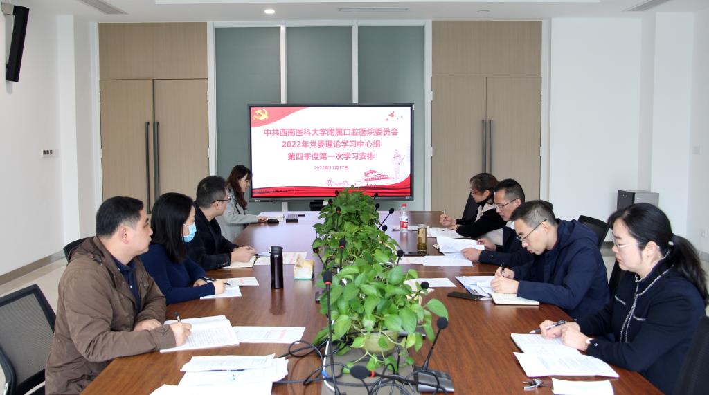 11月17日下午,附属口腔医院在新院行政综合楼一会议室举行了2022年党委理论学习中心组第四季度第一次学习,这也是医院党委理论学习中心组成员调整后的第一次学习。会议由党委书记代天祥主持,全体中心组成员参加了学习。