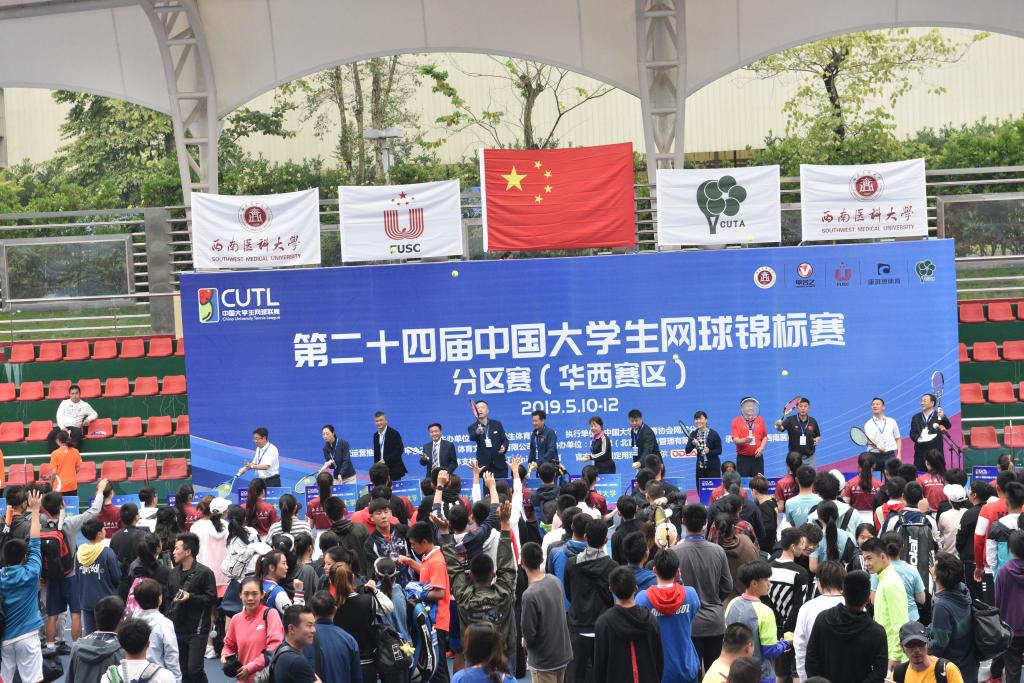 5月11日上午8:30,由中国大学生体育协会主办,全讯承办的第二十四届中国大学生网球锦标赛分区赛(华西赛区)比赛在泸州奥林匹克体育公园网球运动中心球场开幕。中国大学生体育协会网球分会副主席、成都体育学院副校长付东,中国大学生体育协会网球分会秘书长付浩,泸州市人民政府副市长马宗慧,泸州市教育和体育局副局长向立,学校党委常委、副校长刘广益,赛事监督由文华、仲裁韦晓康和赵赟、华西赛区负责人杨学明、华西赛区裁判长陈海,学校体育学院院长王定宣、体育学院党总支书记孔晓明出席了开幕式。